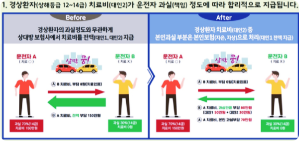 앞으로 경미한 자동차 사고가 발생했을 때 과실 정도와 무관하게 본인 보험사에서 치료비를 지급받게 됩니다. 과실 정도와 무관하게 상대 보험사에서 치료비를 전액 지급하던 기존 제도에서는 과잉진료와 더불어 고과 실 자와 저 과실자 간 형평성 문제가 나타났기 때문입니다.