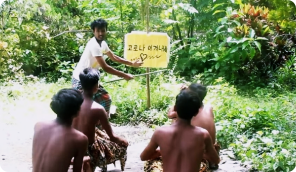 학생들은 춤을 추다 화면 정중앙에 걸린 노란 피켓 앞으로 정렬해 앉는데요. 그러면 선생으로 보이는 한 남성이 등장해 피켓에 적힌 글자를 가리키죠. 여기에는 삐뚤빼뚤한 한글로 적힌 문구가 있는데요. 선생이 어설픈 한국어로 읽는 시범을 보이면, 학생들도 뒤따라 어설프게 따라 읽습니다.