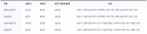 - 연간 12만 원(반기별 6만 원) 한도 내에서 대중교통 실사용액의 100% 지원