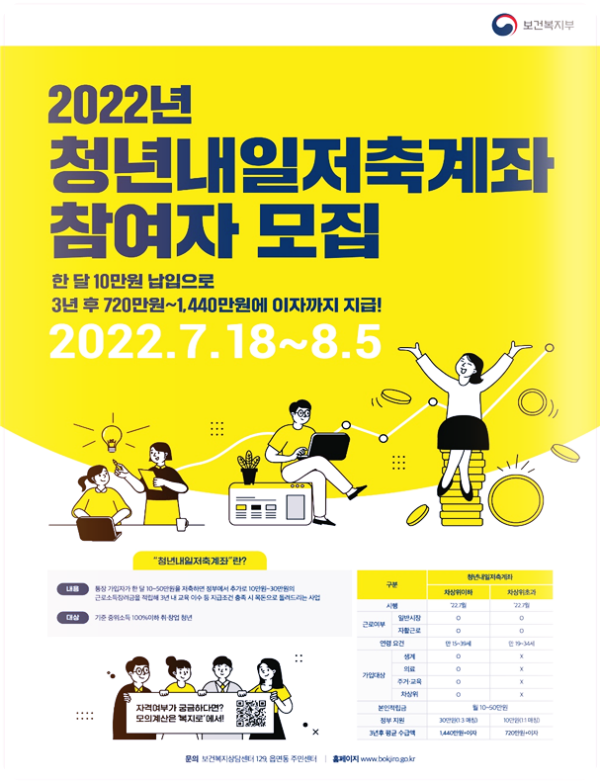 보건복지부는 청년내일저축계좌 가입자를 오는 7월 18일부터 모집한다고 30일 밝혔다.