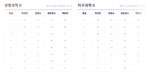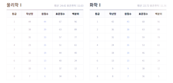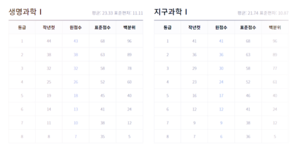 과학 탐구 영역 - 물리학 1, 화학 1, 생명과학 1, 지구과학 1, 물리학 2, 화학 2, 생명과학 2, 지구과학 2 예상 등급컷