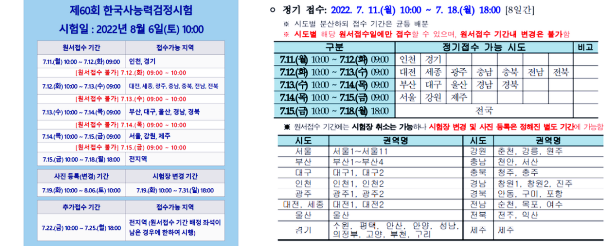 3. 제60회 한국사 능력 검정시험 지역별 원서접수 일정