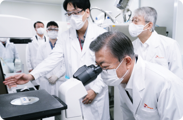 문 대통령은 SK바이오사이언스의 백신 개발 진행 상황에 대한 설명을 듣고, 개발 공정과정(배양 → 정제 → 발효 → 품질검사)에 따라 순차적으로 연구실을 둘러봤습니다. 세포를 고농도로 배양해 코로나 백신 항원을 생산하는 세포 배양실에서 현미경을 통해 배양된 세포를 직접 관찰하는 등 실험을 참관하고 연구자들을 격려했습니다.