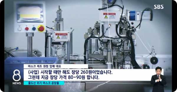 마스크 제조 원청 업체 대표는 사업 시작할 때만 해도 장당 260원이었지만 지금 장당 80~90원이며 계약한 업체들이 수출이 다 안 되고 있는 상황이라고 설명하였습니다.