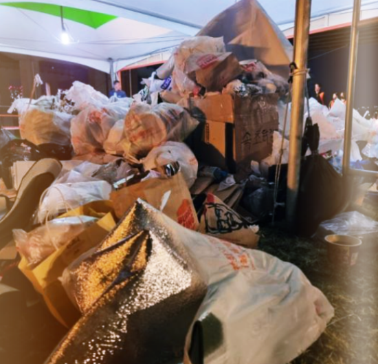 행사를 위해 설치된 안내용 텐트 한쪽에도 쓰레기가 수북하게 쌓였다. 시민 한 명이 맥주병을 놓고 가자 다른 사람들도 농 구하듯 쓰레기를 던지고 갔다. 라면 국물을 위에 쏟아버리는 시민도 있었다. 축제가 끝난 지 15분 만에 허리 높이로 쌓인 쓰레기 더미에선 악취가 흘러나왔다.
