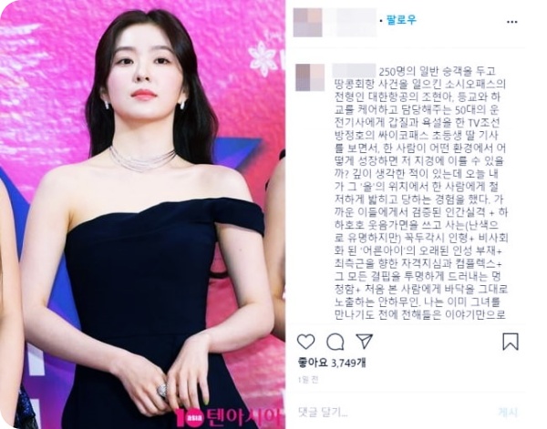 해당 연예인이 누구인지는 직접적으로 언급하지 않았지만, 레드벨벳의 곡 제목인 '사이코(psycho)'와 레드벨벳 아이린·슬기의 곡 제목인 몬스터(monster)'를 글 말미에 해시태그로 달았습니다. 이후 갑질 당사자가 아이린이라는 의혹이 불거지며 파문이 확산됐습니다.