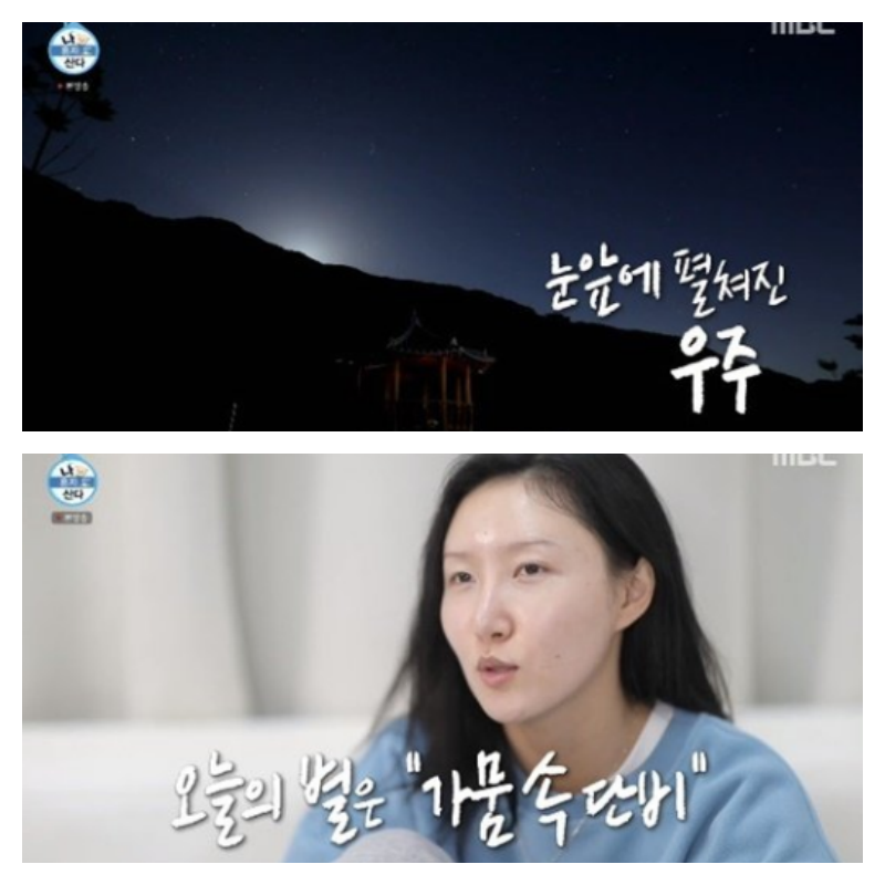CG를 의심하게 하는 별들이 진풍경을 연출했고, 화사는 그곳에서 온전한 휴식을 보내며 야식을 즐겼습니다. 주꾸미 삼겹살 비빔밥을 준비한 화사는 다이어트 중인 사실을 잊은 채 맛깔스러운 먹방으로 눈길을 끌었습니다. 더불어 화사는 별똥별까지 목격했고, 감탄을 자아내는 사진을 남겨 모두를 힐링하게 했습니다.