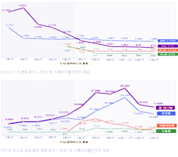 그런데 여러 업체가 마스크 제조에 뛰어들면서 가격은 점차 내려갔고 온라인 마스크 가격은 4월 3000원대, 5~6월 2000원대, 7~9월에는 1000원 초반대로 낮아졌습니다. 지난 27일 식약처가 발표한 ‘마스크 생산 등 수급 동향’을 보면 10월 3주 차(12~18일)에 처음으로 장당 평균 가격이 900원대로 내려앉았습니다.