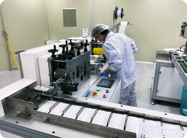 기다랗게 들어가는 세 재료가 만나, 1초에 하나씩 '툭'. 처음 본 기계에선, 마스크가 그리 질서 있게 튀어나왔다. 귀에 거는 끈까지 더해지니 완성. 그러자 파란 장갑을 낀 작업자 세 명이 부지런히 마스크를 모았으며 분주해 보였다.