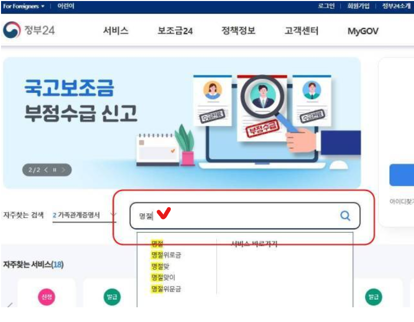 추석 지원금 신청 방법 "정부 24" 홈페이지에 접속하여 검색창에 '추석'을 입력하면 추석지원금에 대한 정보를 확인할 수 있습니다.