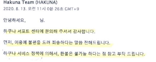 당장 전세금이 날아가 길바닥에 나앉게 된 김씨는 8월 12일부터 하쿠나 라이브 측에 환불을 요구하기 시작했지만 하쿠나 라이브 측은 자사 정책을 이유로 “환불 책임이 없다”라고 주장했습니다. 또 "플랫폼 기업으로서 호스트의 동의 없이 일방적으로 환불을 진행하기 어려운 점이 있다"라고 해명했습니다. 하쿠나 라이브는 시청자가 보낸 후원금의 절반 가까이를 수수료 명목으로 가져가는 것으로 알려졌습니다.