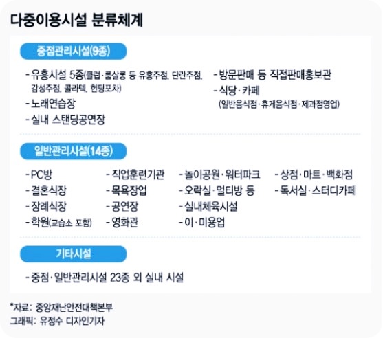 중점관리시설은 △유흥시설 5종 (클럽·룸살롱 등 유흥주점, 단란주점, 감성주점, 콜라텍, 헌팅포차) △노래연습장 △실내 스탠딩 공연장 △방문판매 등 직접 판매홍보관 △식당·카페(일반음식점·휴게음식점·제과점영업) 등입니다.