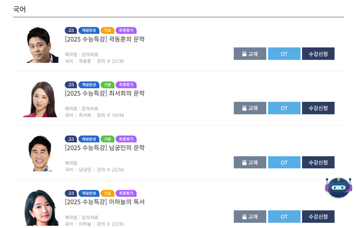 - 수능특강 페이지에서 PDF 파일을 다운받고 싶은 과목을 선택합니다. 예를 들어, 국어 수능특강을 선택하면 다음과 같은 화면이 나옵니다.