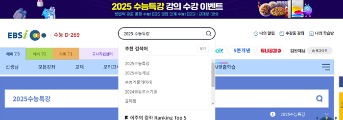 - 고교강의 페이지에서 '수능특강'을 클릭합니다.