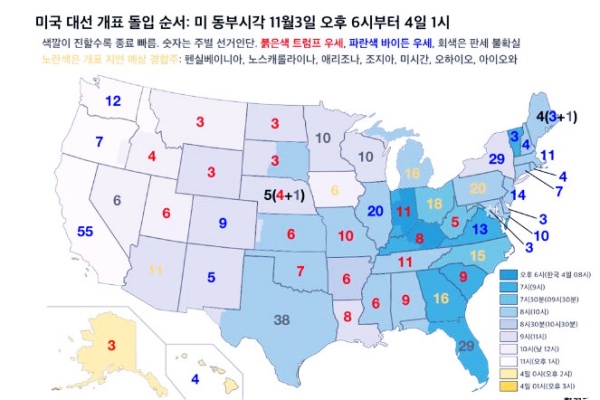 한편 AP와 NYT에 따르면 트럼프 대통령과 바이든 후보는 미국 동부 주를 중심으로 각각 55명, 85명의 선거인단을 확보한 것으로 추정되며 현재까진 2016년 대선 결과를 각 주가 따라가는 모습입니다.