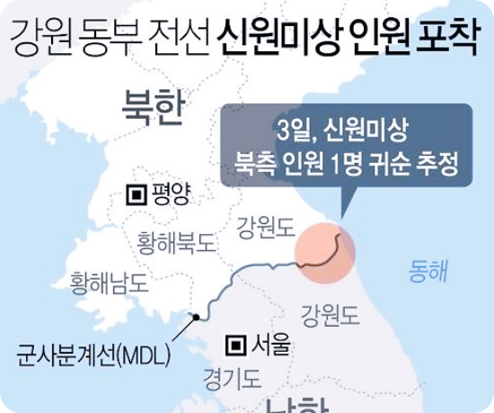 앞서 군 당국에 따르면 3일 저녁 7시 26분경 강원도 동부지역 전방 북측에서 수상한 인원이 철조망을 넘어 남쪽으로 향하는 장면이 군 감시 장비에 포착됐습니다. 군 당국은 대침투경계령인 '진돗개 둘'을 발령하고 대대적인 수색작전을 펼쳤습니다.