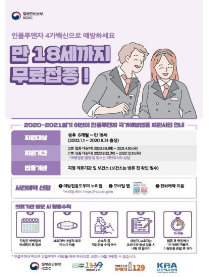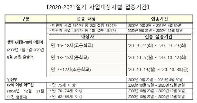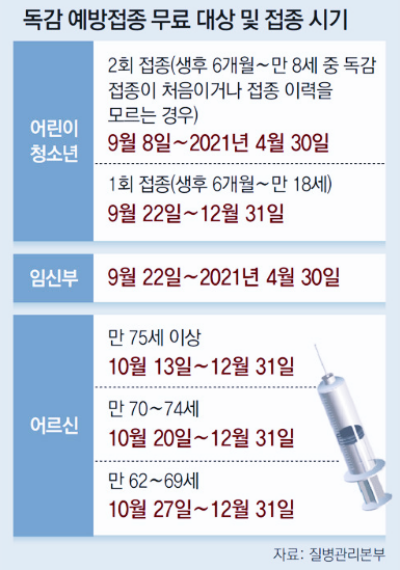 이번 2020∼2021년 인플루엔자 예방접종을 무료로 받을 수 있는 국가예방접종 대상자는 생후 6개월∼만 18세 소아·청소년과 임신부, 만 62세 이상 어르신입니다.