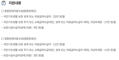 - 양육수당: 장애아동의 양육에 필요한 비용을 지원합니다. 지원 금액은 아동의 연령과 장애 정도에 따라 다르며, 월 최대 50만 원까지 지원됩니다.