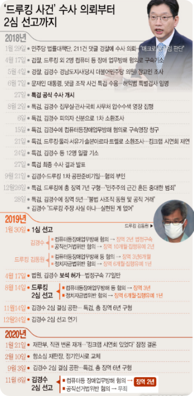 컴퓨터등이용장애는 드루킹 김 씨와 짜고 네이버 댓글 조작 공작을 벌였다는 내용입니다. 공직선거법 위반은 그 대가로 김 씨 일당 중 한 명인 도모 변호사에게 센다이 총영사 직을 제안해 공직을 거래했다는 내용입니다.