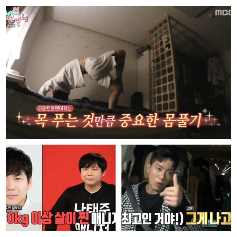 태권 트롯의 창시자 나태주는 새벽 4시에 일어나자마자 다리찢기, 물구나무서서 팔 굽혀 펴기 등으로 몸을 풀었습니다. 매니저 김한솔 씨는 편의점에서 사 온 컵밥을 들고 나태주의 집을 찾아왔습니다.
