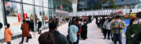 13일 오전 10시 30분쯤 서울 잠실 롯데월드 몰 유니클로 매장 앞. 이날 두 시간 전부터 매장 문이 열리기만을 기다리던 사람들이 수백 m에 달하는 긴 대기줄을 만들고 있었습니다. ‘줄 서는 곳’이라는 안내 팻말을 들고 있던 유니클로 직원들은 코로나 예방을 위해 일일이 체온 체크를 했습니다.