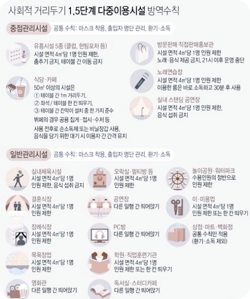 1.5단계 하에서는 다중이용시설 23종(중점관리시설 9종·일반관리시설 14종) 등을 중심으로 방역조치가 강화됩니다.