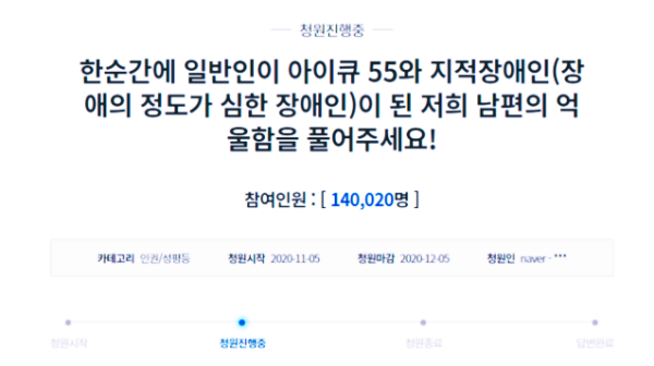 청와대 국민청원 게시판에 올라온 ‘한순간에 일반인이 아이큐 55와 지적장애인이 된 저희 남편의 억울함을 풀어주세요’라는 제목의 글은 19일 오후 5시 10분 현재 동의 수 14만 명을 넘어섰습니다.