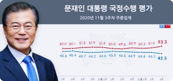 문 대통령의 지지율은 40% 초반대에서 횡보하고 있다. 본보가 알앤써치에 의뢰해 실시해 지난 18일 발표한 11월 셋째 주 정례조사에서 문 대통령 국정수행에 대한 긍정평가는 42.4%로 나타났습니다. 리얼미터가 tbs 의뢰로 19일 공개한 여론조사에서도 42.5%로 집계됐습니다. 리얼미터 조사 결과는 특히 조국 전 법무부 장관을 둘러싼 논란이 불거졌던 지난해 10월 2주 차(41.4%) 이후 가장 낮은 수치입니다.