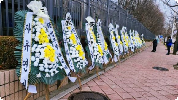 자유연대는 이날 보도자료를 통해 "내달 19일까지 정부과천청사 정문 앞에서 집회를 열고 근조화환을 전시하겠다고 경기 과천경찰서에 신고했다"며 "추 장관이 본인에게 온 꽃 자랑을 하고 있는데 진짜 민심을 보이기 위해 근조화환을 설치했다"라고 밝혔습니다.