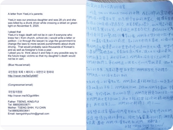 대만 유학생 쩡 이린(曾以琳·28)씨의 모친은 26일 “우리 딸의 희생이 헛되지 않도록 도와주길 바란다”며 가해자인 음주운 전자 엄벌을 요청하는 대만어 손편지를 모 매체에 이메일로 전달했습니다. 모친은 “딸을 아는 모든 사람이 한국 정부가 음주운전 처벌을 강화하도록 탄원해주길 바란다”라고 호소하는 영문편지도 함께 보냈습니다.