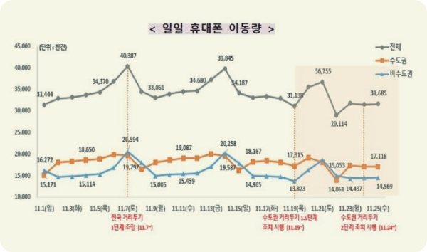 중앙사고 수습본부(중수본)에 따르면 이달 19일부터 25일까지 최근 1주일간 일일 평균 휴대전화 이동량은 전국 3천252만 건이며 지역별로는 수도권이 1천717만 3천 건, 비수도권 1천534만 7천 건으로 파악됐습니다.