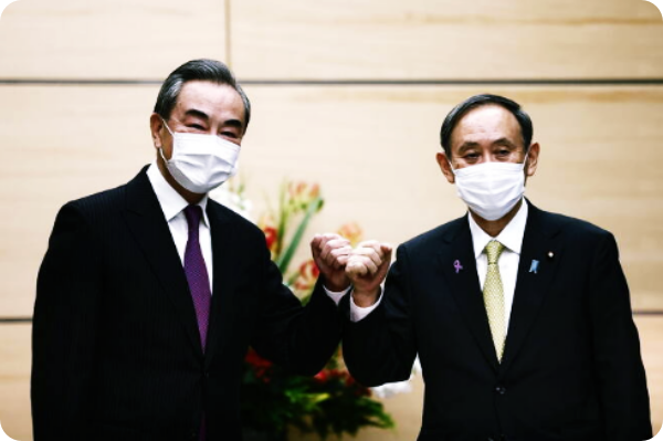 이에 견줘, 24~25일 왕 부장의 일본 방문은 냉랭한 분위기에서 끝났습니다. 왕 부장은 일본에선 협력이 필요한 가까운 이웃이라는 ‘일의대수’(一衣帶水)란 말을 꺼내들었습니다. 왕 부장은 모테기 도시미쓰 외무상과 회담에서 중-일 관계를 ‘장기적 협력 동반자’라고 하며 “적절한 전략적 소통”이 필요함을 강조하는 데 그쳤습니다.