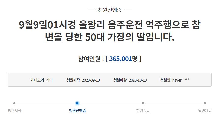 11일 청와대 국민청원 게시판에 따르면 '9월 9일 01시경 을왕리 음주운전 역주행으로 참변을 당한 50대 가장의 딸입니다'라는 제목의 청원이 전날인 10일 올라왔습니다.