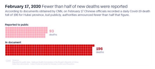 코로나 사망자 수도 대폭 축소한 것으로 드러났습니다. 2월 17일 후베이성 내 사망자 수는 93명으로 발표했지만 문서 상 사망자 수는 196명에 달했습니다.