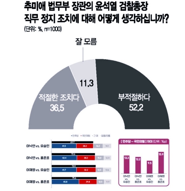 윤석열 검찰총장에 대한 직무정지 조치가 '부적절하다'는 답변이 과반을 차지하고 '적절하다'는 의견은 36%에 그치는 여 론조사 결과가 나왔습니다.