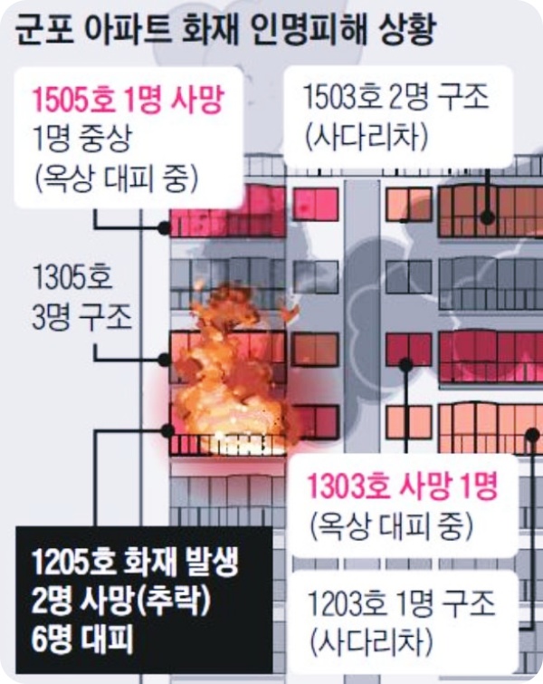 지난 1일 경기도 군포시 산본동 아파트 화재는 인테리어 공사를 하던 12층 한 가구에서 발생했습니다. 그러나 피해는 해당 가구보다 이웃 주민들이 더 컸으며 불이 난 가구의 위층 5가구에서 2명이 사망하고, 7명은 중경상을 입었습니다.