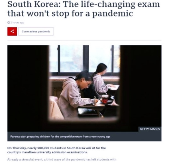 2일(현지시간) BBC는 수능에 대해 "한국, 팬데믹(대유행)에도 멈추지 않는 인생을 바꾸는 시험"이라며 "이를 위해 거의 50만 명의 수험생들이 수능에 응시할 것"이라고 보도했습니다.