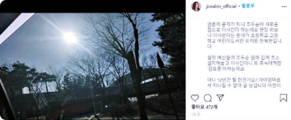 조수빈 아나운서는 지난 4일 자신의 SNS에 "조두순이 이사 왔다는 동네로 일 보러 오게 됐다(주민들 불편하실 수 있으시니 장소는 말씀 안 드리겠다)"라고 운을 뗐습니다.