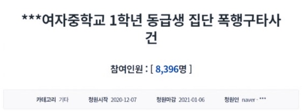 집단폭행 의혹은 해당 부모가 자신의 입장을 지난 7일 청와대 국민청원 게시판에 올리면서 알려졌으며 8일 오후 1시 기준, 청원 인원은 하루 만에 8097명의 동의가 달렸습니다.