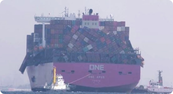 세계적인 선박회사인 오션 네트워크 익스프레스에 따르면 일본 국적의 선박 ‘원 에이퍼스’는 지난달 30일 중국을 출발해 캘리포니아 롱비치까지 화물을 운반하던 중 하와이 북서쪽 약 2600㎞ 떨어진 지점에서 강풍과 큰 파도를 만났습니다.