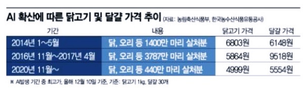 2016~2017년에는 산란계 36%가 처분돼 일부 지역에서 달걀 한 판(30개) 가격이 1만 원을 넘어서는 '달걀 파동'이 시작돼 미국에서 달걀을 공수하기도 했습니다. 올해는 신종 코로나바이러스 감염증(코로나 19) 영향으로 내식 수요가 늘어나, AI가 장기화할 때는 더 크게 가격이 오를 거란 우려가 나오고 있습니다.