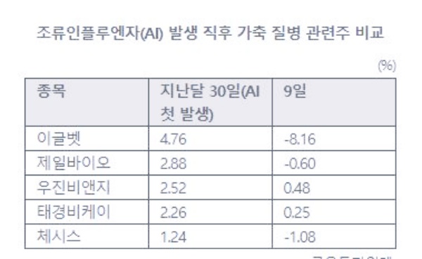 한편 조류 인플루엔자 관련주에 대해 관심이 높아지고 있는데요, 지난달 올 겨울 첫 조류인플루엔자(AI) 발생 이후 급등했던 가축 질병 관련주들이 숨 고르기에 들어갔습니다.