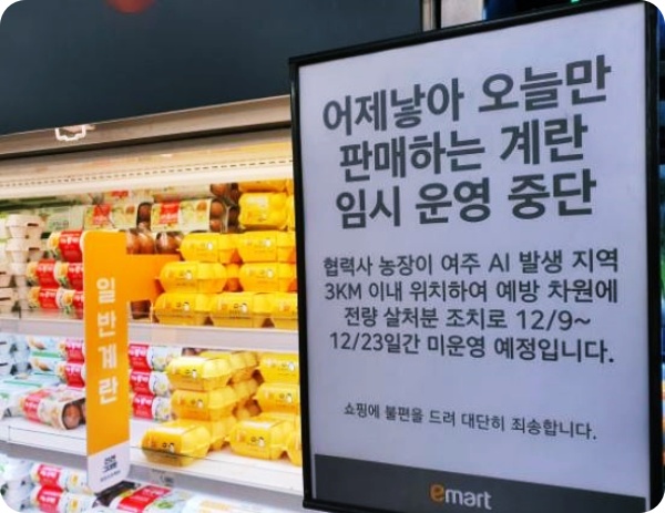 10일 오후 8시 서울 성동구의 이마트 왕십리점 달걀 판매대에는 극신선 달걀 '어제 낳아 오늘만 판매하는 계란'의 운영 중단을 알리는 공지가 붙었습니다. 해당 달걀을 생산하는 농장이 여주 AI 발생 지역 3km 이내에 위치해 예방 차원으로 산란계를 전량 살처분해 운영이 불가능해졌습니다.