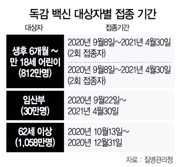 질병당국은 혼잡함을 피하기 위해 생후 6개월부터 83개월까지 어린이와 만 16~18세(고등학생)는 9월22일부터, 만 13세~15세(중학생)는 10월 5일부터, 만 7세~12세(초등학생)는 10월 19일부터 구분해 집중 접종을 실시합니다.
