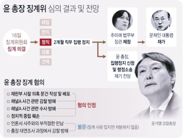 법무부 검사징계위원회가 16일 새벽 윤석열 검찰총장의 징계 혐의를 인정하고 정직 2개월 처분을 내렸습니다. 검찰총장을 징계한 것은 헌정사상 초유의 일입니다. 아직 대통령의 재가가 남아있지만, 대통령이 집행하면 윤 총장은 법무부 징계에 따라 2개월간 직무 집행이 정지됩니다.