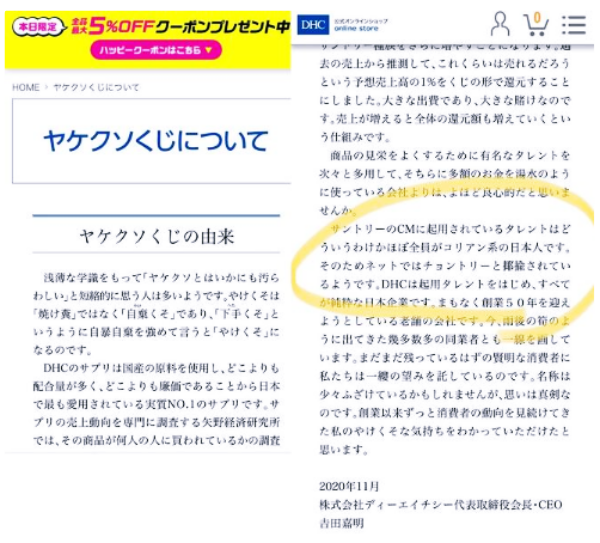 이런 가운데 11월 하순 DHC가 자사의 홈페이지에 '안 될 거야 복권의 유래에 대해'라는 글을 게재하면서 다시 논란에 휩싸였습니다. '안 될 거야 복권(ヤケクソ くじ)'은 DHC가 올해 10월부터 시작한 일종의 경품 이벤트인데 자사 상품을 애용하는 소비자들을 위해 매월 335명을 추첨해 1만 엔 상당의 상품권을 선물한다는 취지에서 마련됐으며 10월에는 문제없이 넘어갔습니다. 그런데 11월분 추첨을 알리는 공개 안내문 마지막 부분에 다음과 같은 내용이 들어갔습니다.
