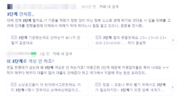 각종 온라인 커뮤니티와 맘카페에서는 "3단계 왜 안 하는지 모르겠다. 이러다 국민 모두 걸리는 것 아니냐", "나도 자영업자지만 차라리 짧고 굵게 3단계 해서 확산세를 잡는 게 나을 것 같다", "경제 때문에 신중하게 생각하자는 건데 확진자가 너무 늘어 당장 격상해야 하는 것 아닌가", "요즘엔 일상생활에서 감염되고 있어 안전을 위해서 올려야 한다고 생각한다" 등 우려의 반응이 나오고 있습니다.