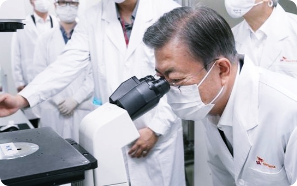 문 대통령은 10월 15일 SK바아오 사이언스를 방문해 “치료제는 올해 안에 본격 생산을, 백신은 내년까지 개발 완료를 기다릴 수 있게 됐다. 생산물량 일부를 우리 국민에게 우선 공급할 수 있게 된다면 백신의 안정적 확보에도 큰 힘이 될 것”이라고 말했습니다. 지난달 18일 인천 바이오산업 현장을 방문해서도 “올해 말 항체 치료제와 혈장 치료제를 시장에 선보일 수 있을 것”이라고 했습니다.