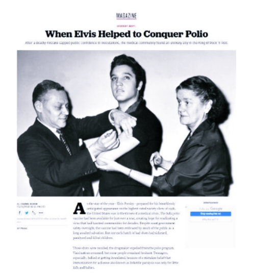엘비스 프레슬리의 소아마비 접종을 도왔던 당시 보건부 직원 루스 대버, 올해 91세인 그녀는 64년 전 그 날을 회상했습니다. '엘비스가 소아마비 정복을 도왔을 때'란 기사의 제목처럼 전설적인 로큰롤 가수의 공개 접종 이후 미국 청소년의 소아마비 백신 접종 비율은 0.6%에서 80%로 증가했고 지금 지구에서 거의 사라진 질병이 되어 있습니다.