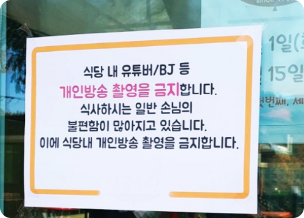 식당 주인은 유튜버의 허위 방송으로 자영업자가 피해를 보지 않도록 규제해달라는 국민청원을 올리며 논란이 일파만파 확대됐습니다. 유튜버 송대익은 주문한 피자와 치킨을 배달원이 먹었다는 허위 영상을 올렸다 소송을 당했습니다. 무책임한 유튜브 영상에 자영업자들의 피해가 잇따르자 일부 식당들은 아예 매장 내 개인방송을 금지하고 동의 없는 촬영물을 게시하면 법적 조치를 취하겠다는 안내문까지 내걸고 있는데 이른바 노 튜버(NO+유튜버) 존입니다.